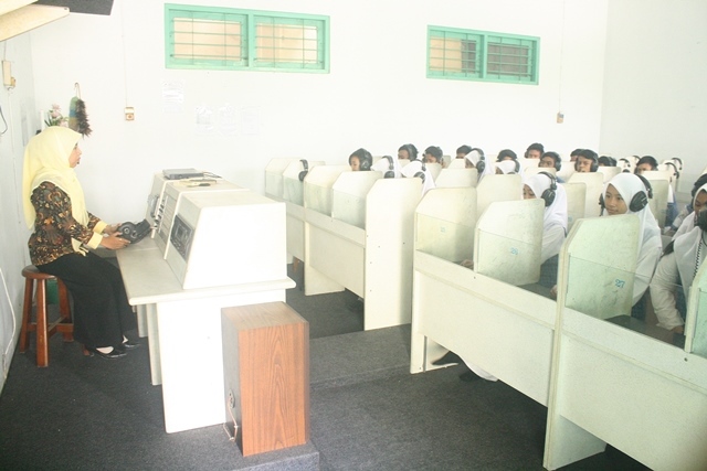 Laboratorium bahasa merupakan alat untuk melatih pembelajar mendengarkan dan berbicara dalam bahasa asing dengan cara menyanjikan materi pembelajaran yang telah disediakan sebelumnya. Dengan memutar rekaman yang berisi pembelajaran siswa menjawab pertanyaan atau mengulangi kalimat atau lafal kata-kata.